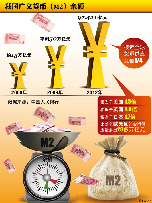 中国人民银行统计数据显示,截至去年末我国广义货币(