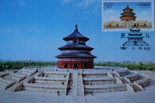 新中国邮票中以“天坛”为主图的不在少数,全国各地发行的以“天坛”为主图的明信片也数量不少。1997年发行的《天坛》邮票,用的是80年代北京邮政局发行的《天坛》明信片来制作极限片,主图完全对位,连天上的云彩都相似,片先票后,且加盖首日异形风景邮戳,从规则角度没有任何可以挑剔的毛病,是不折不扣的A级藏品。