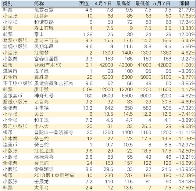 金银币板块的表现十分低调,特别是4月中旬以来更加明显,投资者因国际金银价格的暴跌而持严重观望心态,使得市场买气荡然无存。虽然一些场外投资者在低位吸纳“熊猫”金银币,不过市场的货源充足,无法改变跌势的延续。5月上旬,2013版1盎司“熊猫”金币和银币的价格分别下沉至9900元和195元,其中前者为1盎司“熊猫”金币近年来首度跌穿万元大关。