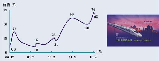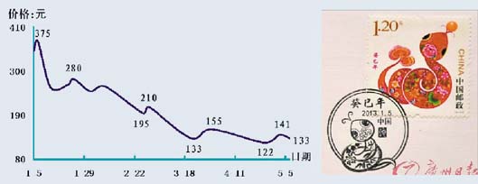 近2个月的新邮发行频仍,虽然出挑品种不少,像3月份发行的“雷锋题词50年”、“桃花”小版张,以及4月份亮相的“捣练图”小型张和“景泰蓝”小版张等,均属于在印刷、版式或题材上有很好卖点的新邮。但从发行后的市场运行趋势看,这些新邮高开走低趋势几乎难以改观,即使是具有“簪花仕女图”小型张神韵的“捣练图”小型张,同样也呈现高开下跌走势,其价格由发行之日的15元回调,到5月初市价跌至12.8元。至于前期发行的“雷锋题词50年”和“桃花”小版张则分别下沉到25元和27元附近。年初以来发行的套票同样也处于回落状态,其中“癸巳蛇”、“十二届人大”、“雷锋题词90年”、“中央党校”、“世界水日”和“桃花”套票分别回调到2元、1.2元、8元、6.5元、2.3元和11元。而“癸巳蛇”全张票、小版张和小本票则处于振荡下滑状态,5月上旬分别跌至129元、47元和18.5元附近。另外,2012全年套票价格跌至153元,春节前夕风光无限的一些套票价格更是遭遇腰斩,如“太平鸟”套票价格已跌至7元下方,与1月末的15元高点相比跌幅不菲。