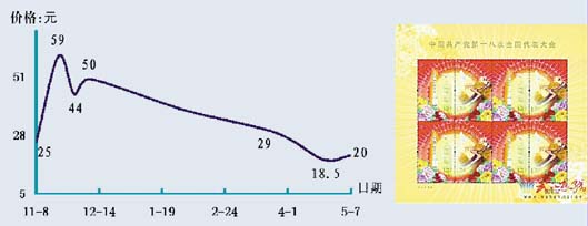 与此同时,近年来发行的小版张继续走弱,如“行书”、“古代书院(2)”、“建党90年”、“资本市场”和“梅兰竹菊”小版张分别下挫到58元、14元、14.5元、38.5元和29元。2012年发行的小版张跌势加剧,其中“延边风情”小版张跌至7月下方,基本接近“打折票”的价位,而“伦敦奥运会”和“共青团90年”小版张分别下挫到7元和6.5元,“丝绸之路”、“招商局”、“十八大”、“福禄寿喜”和“红色足迹”小版张则分回调至10.5元、9元、20元、46元和17.5元,其中“十八大”小版张2个月的回落幅度高达3成。