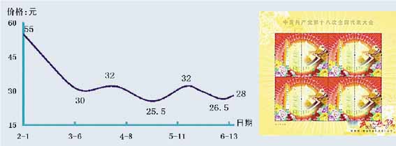 近年来走势较强的新邮,往往是属于庄家参与的品种,但5月份以来不少前期“庄邮”却走出下跌乃至破位的走势,如北京奥运会前后牛气冲天的“北京奥运会徽和吉祥物”不干胶品种在近两个月即呈现破位下滑的表现,其50元的重要颈线位被击破,且因承接虚弱而无法收复,目前价格已下行至43元附近。同样的,“香港回归十周年”和“澳门回归十周年”小全张也在持续的阴跌中击破了40元和30元的支撑位,破位征兆日趋明显。与此同时,“十八大”小版张等一些阶段性“庄邮”的支撑力度也逐渐被削弱,虽然重要颈线位尚未被击破,但价格却在回调中正逐步逼近。由此不难看出,市场对热门品种的运作热情也在不断消退,资金介入积极性不高,而跟风者却畏惧被深套而悄悄出货,令价格回软趋势难以在短期内改观。