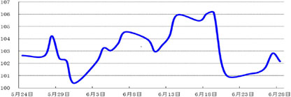 上周,人民币兑美元中间价呈横盘整理走势,当周变化不大,于上周五报6.1787元,较6月21日微跌0.03%;欧元兑美元下跌0.87%,报1.3008美元。