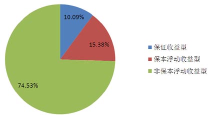 从收益类型来看,保本型产品的发行量环比下滑明显:保证收益型产品发行了353款,较上月减少31款,市场占比下降0.91个百分点至10.09%;保本浮动收益型产品发行了486款,较上月减少114款,市场占比下降3.48个百分点至15.38%。而非保本型产品的发行量则大幅增长:非保本浮动收益型产品发行了2355款,较上月增加124款,市场占比上升4.39个百分点至74.53%,依然是最主要的产品收益类型。(图1)