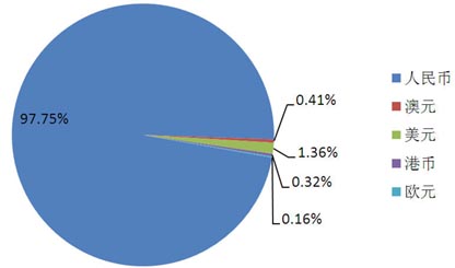 从投资币种来看,人民币理财产品的发行量依旧占据绝对优势地位,该币种产品的发行数量为3089款,较上月减少1款,市场占比上升0.61个百分点至97.75%。外币理财产品方面,美元理财产品发行了43款,较上月减少5款,市场占比下降0.15个百分点至1.36%;澳元理财产品发行了13款,较上月减少10款,市场占比下滑0.31个百分点至0.41%;港币理财产品发行了10款,较上月减少5款,市场占比下滑0.16个百分点至0.32%;欧元理财产品发行了5款,与上月持平,市场占比与上月保持一致,为0.16%。(图2)