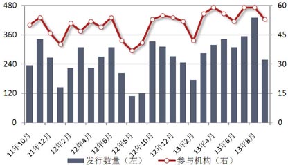 2013年9月,共有53家信托公司发行了257款集合信托产品,环比下降174款,降幅67.70%,数月来的发行回暖中止。发行数量的下跌主要是由于季末因素,季末银行揽存、其他资产管理产品收益上行给集合信托市场带来了分流效应,此外,适逢国情大假之前,节假日因素导致了部分产品缓发。(图5)