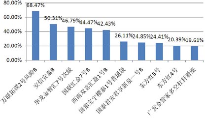 纳入本月考核的阳光私募产品共有1246款,月度平均收益率为1.15%。其中,未跑赢大盘(沪深300指数)的产品中相对收益率低于-4%的产品占比2.68%;-4%至-2%(不含)的产品占比11.27%;-2%至0%(不含)的产品占比12.88%;大多数产品跑赢了大盘,跑赢大盘0%至2%(不含)的产品占比32.92%;2%至4%(不含)的产品占比28.80%;4%至6%(不含)的产品占比9.84%,6%至8%(不含)的产品占比1.43%;高于8%(含)的产品占比0.18%。比较单款产品业绩表现,由华润信托发行的“鑫鹏1期”跑赢同期大盘14.88个百分点,表现最好;表现最差的是由外贸信托发行的“德源安1期”,跑输同期大盘10.34个百分点,二者相差25.22个百分点,较上月缩小31个百分点。从表现靠前的产品来看,月度收益率前十的产品均为股票型产品。(图9)