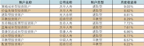 本月,所有投资账户中有171个获得正收益率,其中包括进取型49个、平衡型40个、稳健型52个以及保守型30个。以上四类投资账户的月度平均收益率依次为3.38%、3.01%、1.09%以及0.31%。月度收益表现最好的10个投资账户中,有进取型7个和平衡型3个,排名首位的是太平人寿的策略成长型投资账户。(表2)