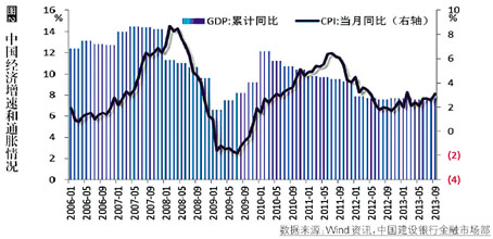 今年前三季度,我国出口1.61万亿美元,同比增长8%;进口1.45万亿美元,同比增长7.3%;贸易差额1694亿美元,同比扩大14.4%;实际使用外资金额886亿美元,同比增长6.35%。对外贸易的持续顺差与国际资本的持续流入造成银行间市场持续的美元抛售压力,截至2013年9月末,国家外汇储备余额为3.66万亿美元,再创历史新高,3季度外储增加1600亿美元,为2011年2季度以来的最大季度增幅。