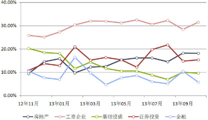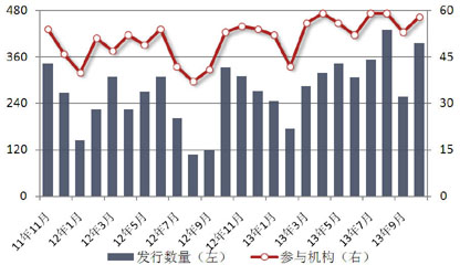 2013年10月,共有58家信托公司发行了396款集合信托产品,环比上升139款,增幅54.09%,在上月报告中,我们提到上月的下降是因为季末因素,而本月即便是有节假日因素,但发行数量依然上季度有明显提高,证明邻近年末,企业融资需求旺盛。银行由于贷款额度等原因,放宽减少,“跷跷板”效应导致集合信托产品增多。(图5)