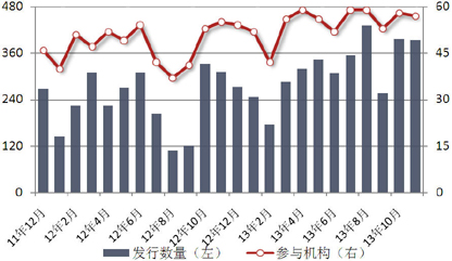2013年11月,130家银行共发行了3883款个人理财产品,较10月份增加704款。其中,122家中资银行发行了3771款,8家外资银行发行了112款。中资银行中,6家国有银行发行了1133款,与10月份相比增加292款,市场占比上升2.72个百分点至29.18%;12家股份制商业银行发行了1054款,与10月份相比增加145款,市场占比下降1.45个百分点至27.14%;74家城市商业银行发行了1339款,与10月份相比增加210款,市场占比下降1.03个百分点至34.48%;29家农村金融机构发行了245款,与10月份相比增加37款,市场占比下降0.23个百分点至6.31%;8家外资银行发行了112款,与10月份相比增加20款,市场占比下降0.01个百分点至2.88%。