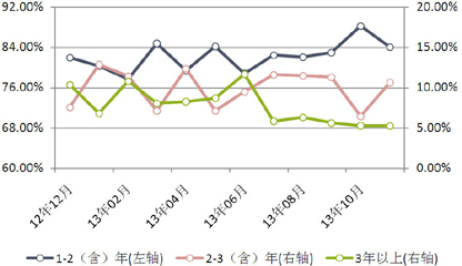已公布期限的246款产品中,1-2(含)年期限段产品发行了222款,占比84.09%,环比下降4.17个百分点;2-3(含)年期限段产品发行了28款,占比10.61%,环比增加4.13个百分点;3年以上期限段产品发行了14款,占比5.30%,环比增加0.04个百分点。最近两个月短期产品和中期产品占比出现反复波动,主要是因为市场对后期通货膨胀率与基准利率的判断起了变化——11月内,多数券商预期CPI会继续走高,根据本届政府“通胀有上限”的原则,加息调准预期升温。(图6)