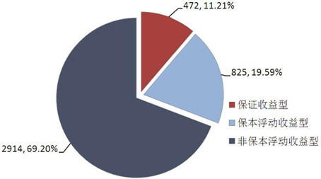 从收益类型来看,保证收益型产品发行472款,环比增加86款,市场占比上升0.01个百分点至11.21%;保本浮动收益型产品发行了825款,环比增加101款,市场占比上升0.01个百分点至19.59%;非保本浮动收益型产品发行了2914款,环比增加141款,市场占比下降0.02个百分点至69.20%,依然是最主要的产品收益类型。(图1)