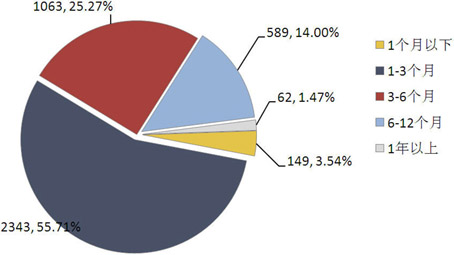 从投资期限来看,1个月(含)以下产品发行149款,环比减少37款,市场占比下降1.25个百分点至3.54%;1-3个月(含)产品发行2343款,环比增加445款,市场占比上升6.76个百分点至55.64%;3-6个月(含)产品发行1063款,环比减少156款,市场占比下降6.15个百分点至25.24%;6-12个月(含)产品发行了589款,环比增加74款,市场占比上升0.72个百分点至13.99%;1年以上产品发行62款,环比增加12款,市场占比上升0.18个百分点至1.47%;无固定期限产品发行5款,环比持平市场占比下降0.27个百分点至0.12%。(图3)