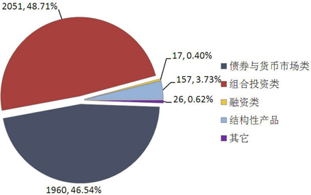 从投向类型来看,债券与货币市场类产品发行了1960款,环比增加271款,市场占比上升3.05个百分点至46.54%;组合投资类产品发行2051款,环比增加181款,市场占比上升0.55个百分点至48.71%;融资类产品发行17款,环比减少9款,市场占比下降0.27个百分点至0.40%;结构性产品发行157款,环比减少14款,市场占比下降0.68个百分点至3.73%;其它类产品发行26款,环比减少101款,市场占比下降2.65个百分点至0.62%。(图4)
