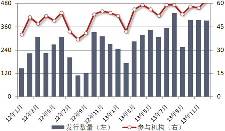 2013年12月,145家银行共发行了4211款个人理财产品,环比增加328款,增速较快主要是因为季末因素加年末因素。其中,137家中资银行发行4116款,8家外资银行发行95款。中资银行中,6家国有银行发行1207款,环比增加74款,市场占比下降0.52个百分点至28.66%;12家股份制商业银行发行1044款,环比减少10款,市场占比下降2.35个百分点至24.79%;83家城市商业银行发行了1483款,环比增加144款,市场占比上升0.73个百分点至35.22%;34家农村商业银行发行376款,环比增加135款,市场占比上升2.72个百分点至8.93%;2家农村信用社发行6款,环比增加2款,市场占比上升0.04个百分点至0.14%;8家外资银行发行95款,环比减少17款,市场占比下降0.63个百分点至2.26%。