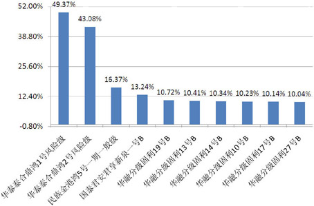 从表现最好的产品收益情况看,进入前十的债券型产品9款,混合型产品占了1款。(图10)