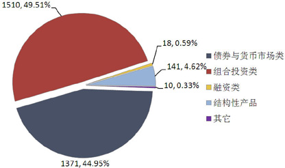 从投向类型来看,债券与货币市场类产品发行1371款,环比减少589款,市场占比下降1.59个百分点至44.95%;组合投资类产品发行1510款,环比减少541款,市场占比上升0.80个百分点至49.51%;融资类产品发行18款,环比增加1款,市场占比上升0.19个百分点至0.59%;结构性产品发行141款,环比减少16款,市场占比上升0.89个百分点至4.62%;其它类产品发行10款,环比减少16款,市场占比下降0.29个百分点至0.33%。(图4)