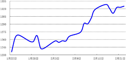 上周,因美国近期公布的经济数据弱于预期,市场对美国经济复苏步伐的担忧增多,机构避险需求抬升,国际金价上升6.68美元/盎司至1325.18美元/盎司;此外,布伦特原油价格较前周五上升0.77美元/桶至109.85美元/桶。