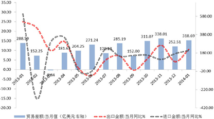 1月,日本对外贸易出口金额同比增长9.46%,进口金额同比增长25.06%,贸易逆差放大至2.79万亿日元,同比增加70.9%,创历史新高。日本2013年12月经常项目逆差规模创记录新高6386亿日元,由此2013年全年经常项目盈余收窄至纪录最低值3.3万亿日元。受日本新年的影响,日本国内消费需求的增长将带动进口的飙升,加之日元疲软令进口成本大幅增加,将进一步加剧货物和服务项的赤字,预计今年一季度日本经常项目仍然难以恢复高额顺差的局面。