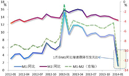 金融:货币供应量1方面,截至1月末,M2同比增速较上月回落0.4个百分点至13.6%,最大拉动因素为信贷投放的放量。此外,M1同比增长骤降8.1个百分点至1.2%,,一方面是由于春节因素造成现金需求增多,另一方面则可能是由于企业对未来经济增长前景不太乐观,减少活期存款形式的流动性资金储备。此外,两个新的因素也值得关注,一是银行理财产品以及互联网金融产品对于银行存款存在一定分流作用;二是普通企业的融资需求在当前信贷机制下仍难得到充分满足,中小企业资金面偏紧。(图5)