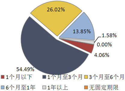 从投资期限来看,1个月及以下产品共发行了126款,环比增加24款,市场占比上升0.71个百分点至4.06%;1-3个月产品共发行了1692款,环比减少86款,市场占比下降3.80个百分点至54.49%;3-6个月产品共发行了808款,环比增加46款,市场占比上升1.04个百分点至26.02%;6-12个月产品共发行了430款,环比增加50款,市场占比上升1.39个百分点至13.85%;1年以上产品共发行了49款,环比增加21款,市场占比上升0.66个百分点至1.58%;无固定期限产品没有发行。(图3)