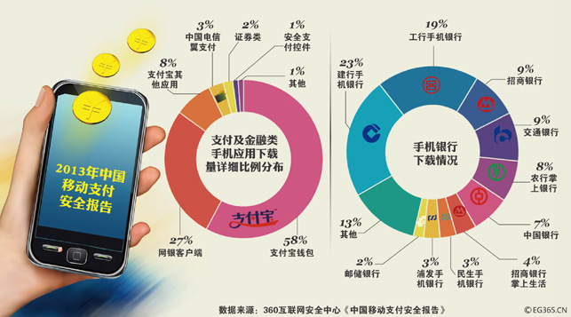 360互联网安全中心发布国内首个移动支付安全报告,报告显示,2013年中国手机支付用户规模达到1.25亿,同比增长了126.0%。支付宝占移动支付绝对优势占比高达58%。据统计,国内外各大银行推出的网银手机客户端应用产品多达170余款,在网银手机客户端下载前五名中,建行手机银行下载最多、其次分别是工行、交行、招行和农行。图/CFP