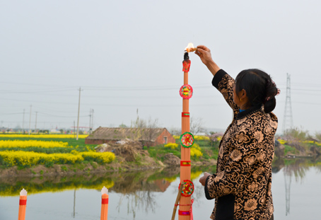 马庄庙会确如期待中的热闹而隆重。村里的大码头边,三五只赶集而来的船只已经准备下货,想必是想抢个好的摊位。连唱三天的大戏,当晚提前开锣。不知从哪儿请来的淮剧班子,除了吹拉弹的,五个人一台戏,咿咿呀呀三个多小时,偶尔丢下的包袱,依然能把台下的老少爷们儿逗得哈哈大笑。正日一早,法华寺门前被游行的队伍和看热闹的群众围得水泄不通,锣鼓喧天,鞭炮齐鸣。有意思的是游行的队伍中不少人身上都佩着一条“感谢老板大力支持”的彩带——但凡捐款超过一千元的单位和人员都会用横幅、条幅在村中醒目展示。富人们集聚的别墅区虽在村郊,“马皮”的队伍还得要特意地走上一趟。如此看来,神灵也不得不优先服务于有钱的主儿,有钱为纲嘛。也正是游行时间太长,多是老人的游行队伍最后显得疲惫不堪。赛会表演时,龙没舞几下,踩高跷的也爬不上高蹬,草草地散了场子,让位于集会和下午的戏班子了。