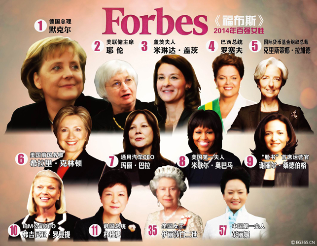 《福布斯》杂志公布了其2014年100名最具权势的女性排行榜。其中,德国总理默克尔排名第一位,这是她第9次登顶此榜单。韩国总统朴槿惠排名第11位,英国女王伊丽莎白二世排名第35位,彭丽媛排名第57位。《福布斯》称,这100位权势女性在社交媒体上共计拥有超过8.12亿粉丝。图/CFP