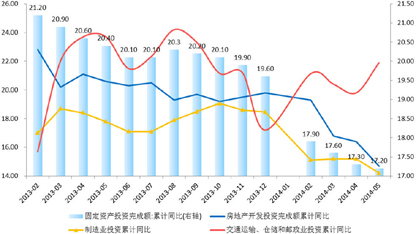 2014年1-5月份固定资产投资同比增长17.2%,符合市场预期,较1-4月份的17.3%小幅回落;5月当月同比增长16.9%,季调环比折年增速17%。