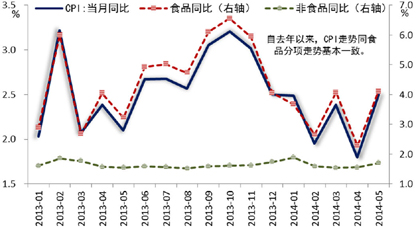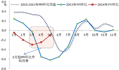 1-5月,CPI同比涨幅均值为2.2%,去年同期为2.4%。从1-5月CPI分项环比走势看,受反腐和整顿“四风”政策的影响,烟草及酒类价格仍处颓势,环比运行通道一直保持在历史均值下方;居住价格涨势弱于历史同期,主要是源于国内房地产市场周期性调整带来的建房及装修材料价格、房屋租金回落;而交通通讯价格则在要素价格改革稳步推进的过程中受到持续而节奏平稳的支撑,环比涨幅略高于历史水平。