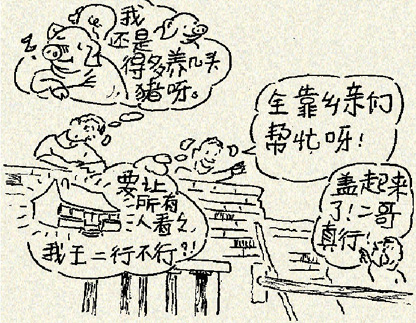 开春了,王二一家开始忙着盖房子。王二盘算,今年把大房子盖好。来年再给大儿子盖房,后年再张罗二儿子的房子,小儿子的房子等到三年后才能轮上了。
