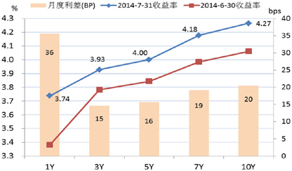 7月,受技术性回调、资金面较预期偏紧、经济数据超预期改善、新股IPO发行和个别时点一级市场招标情况不理想等多因素影响,国债收益率曲线较6月末平坦化上行。1年期国债收益率的上行幅度最大,为36bps;其次是7年和10年期收益率分别上行19bps和20bps;上行幅度相对较小的是3年和5年期,分别上行了15bps和16bps。(图3、4)