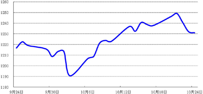 上周,因美国股市持续震荡,令市场投资者对全球经济忧虑升温,提振了黄金的避险需求,国际金价周五收盘于1237.69美元/盎司,较前一周上涨1.20%。