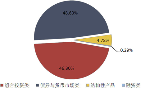 从投向类型来看,债券与货币市场类产品发行2177款,环比增加240款,市场占比上升2.77个百分点至48.63%;组合投资类产品发行2073款,环比增加16款,市场占比下降2.39个百分点至46.30%;融资类产品发行13款,环比增加2款,市场占比上升0.03个百分点至0.29%;结构性产品发行214款,环比减少5款,市场占比下降0.40个百分点至4.78%。(图4)