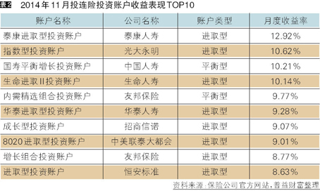 截至2014年11月底,在运行的投连险投资账户共计184个,所有投资账户的月度平均收益率为3.11%。