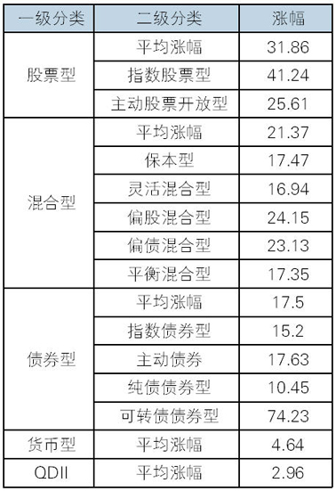 在偏股基金中,指数型基金平均涨幅达到了41%位居各类基金首位,其中国投瑞银沪深300 ETF、国泰上证180金融ETF分别以89.11% 89.04%的涨幅位居前二。