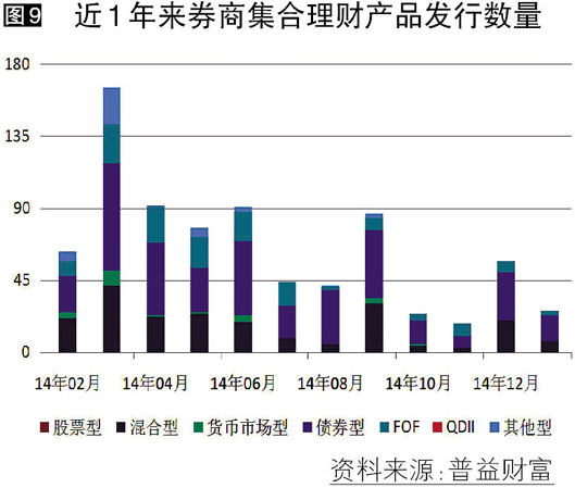 本月,8家证券公司或其资管公司发行券商理财产品26款,环比减少31款,降幅54.39%,平均首发目标规模11.01亿元,环比减少3.21亿元,降幅22.59%;债券型产品发行16款,环比减少14款,降幅46.67%,平均首发目标规模14.34亿元,环比减少0.74亿元,降幅4.91%;混合型产品发行7款,环比减少13款,降幅65.00%,平均首发目标规模1.25亿元,;FOF产品发行3款,环比减少4款,降幅57.14%,平均首发目标规模0.87亿元,环比减少1.43亿元,降幅62.10%