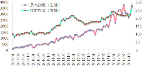 第一,理财指数两极分化。截至2014年底,银行理财景气指数和收益指数分别收于3792点和272点,较去年同期分别增长24.3%和13.8%。分开来看,景气指数年度运行在波动中呈现总体上行态势,个别月份出现短时波动,表明银行理财产品市场放量发行;收益指数自2014年以来,进入下行通道,反映出理财产品收益率趋势性下滑,尾端上行主要缘于“年末效应”的短暂冲击。参见图1。