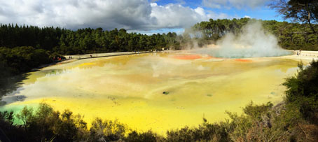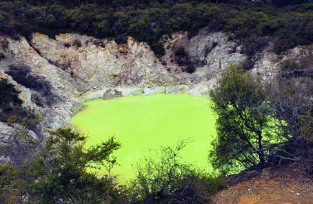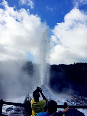 “WAI-O-TAPU”在毛利语中有圣水的意思。这个被称为大自然调色盘的地热公园,是由早期火山喷发所形成的岩浆地热。其中最著名的是每天早上1015Lady Knox Geyser间歇喷泉,喷出的水柱高20-30米。这可不是普通的喷泉,是地热直接喷发出带着浓厚的硫磺气味的喷泉。解说在10点时准时出现在喷泉旁,先是有人往里面倒了点东西,应该就是这喷泉的引子,几秒钟后喷泉开始跃跃欲试,解说也迅雷不及掩耳之势的跑开了,一点点、一点点,水柱越来越高,直到形成烟雾缭绕般,仰起头,水柱已升至大概有30米左右的高空了。