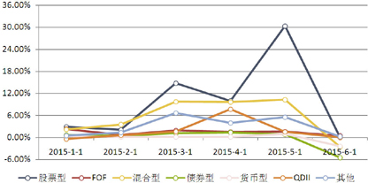 2015年上半年,券商理财产品共发行1546款,较去年同期增加235款,增幅39.50%;环比增加558款,增幅205.15%。其中,混合型261款,占比33.76%;债券型248款,占比32.08%;FOF产品101款,占比13.07%;股票型97款,占比12.55%;货币市场型27款,占比3.49%;QDII产品1款,占比0.13%;其他产品38款,占比4.92%。与阳光私募不同的是,券商集合理财在5月和6月出现井喷,即便是在大盘回调的6月份,发行数量仍然较多。(图9)