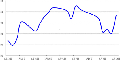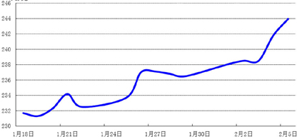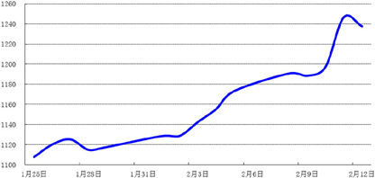 春节期间,国际金融市场动荡不安,投资者对黄金的避险需求迅速增加,国际金价快速上涨。2月12日,国际金价收盘于1237.66美元/盎司,较前一周上涨5.49%。