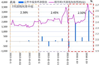 2016年首月资金面出现收紧趋势,7天回购利率月度中枢为2.50%,较上年12月的2.45%上升5bps。(图1