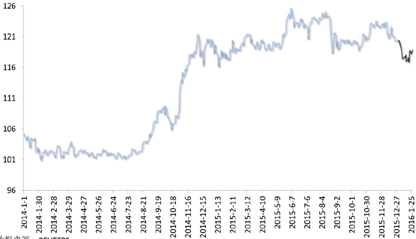 1月,日元对美元先涨后跌。月初,全球股市、原油市场纷纷惨淡开年,美国及中国股市遭遇大规模抛售潮,标普500跌至201410月以来最低水平,沪指跌入熊市,甚至日本股市也正式进入技术定义上的熊市,加之油价暴跌,击穿30美元/桶整数关口。在此背景下,传统的避险资产——日元受到投资者大幅追捧,日元对美元快速升值。120日,日元对美元最高触及115.96的逾一年高位。129日,日本央行货币政策会议后超市场预期宣布执行负利率政策,引发资本市场剧烈动荡,日元一度暴跌2%,连续突破119120121三个整数关口后小幅回调。截至129日收盘,日元对美元报121.12,较2015年末小幅贬值0.75%。(图5