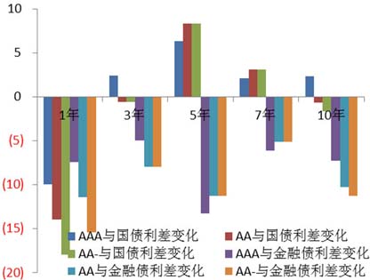 2016年2月份,高等级信用债收益率曲线陡峭化,1年期下行10bps,长端几无变化。信用债相对于国债信用利差短端收窄幅度较大,达7-15bps,中长端有拓宽。由于金融债相对国债利差拓宽幅度较大,信用债相对于金融债利差全面窄。(图4、图5)