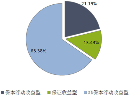 从收益类型来看,保证收益型产品发行了976款,环比增加20款,市场占比上升0.70个百分点至13.43%;保本浮动收益型产品发行了1540款,环比增加18款,市场占比上升0.92个百分点至21.19%;非保本浮动收益型产品发行了4752款,环比减少278款,市场占比下降1.61个百分点至65.38%。(图1)