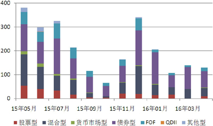 本月21家证券公司或其资管子公司发行了130款券商理财产品,环比减少10款,降幅为7.14%,平均首发目标规模10.60亿元,环比增加3.17亿元,升幅为42.66%。其中,债券型产品发行了68款,环比减少24款,降幅为26.09%,平均首发目标规模10.59亿元,环比增加5.32亿元,升幅为101.05%;混合型产品发行了35款,环比减少5款,降幅为12.50%,平均首发目标规模11.16亿元,环比增加0.39亿元,升幅为3.65%;股票型产品发行了10款,平均首发目标规模15.55亿元;FOF产品发行了15款,环比增加7款,升幅为87.50%,平均首发目标规模9.77亿元,环比减少6.50亿元,降幅为39.96%;货币市场型产品发行了2款,平均首发目标规模0.75亿元。(图9)
