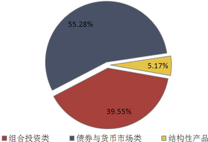 从投向类型来看,债券与货币市场类产品发行了4116款,环比增加10款,市场占比下降1.22个百分点至55.28%;组合投资类产品发行了2945款,环比增加182款,市场占比上升1.54个百分点至39.55%;结构性产品发行了385款,环比减少14款,市场占比下降0.32个百分点至5.17%;融资类产品仍然没有发行。(图4