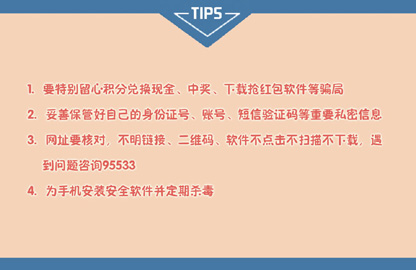 值得注意的是,不法分子往往通过伪基站,任意假冒“10086”“95533”或卡组织,随机发送诈骗短信,以积分兑换现金、调高卡片额度、系统升级等名义诱导客户登录短信中的钓鱼网站,从而窃取客户卡号、安全码、有效期、动态验证码等重要信息并冒用客户身份盗用账户资金。因而,切勿随意点击短信中附带的不明网址链接,切记建行95533短信无链接。手机动态验证码相当于交易支付密码,绝不告知或转发他人。