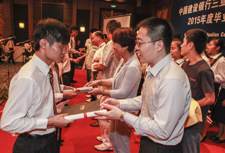 建行代表向三亚百年职校2015届毕业生颁发毕业证书